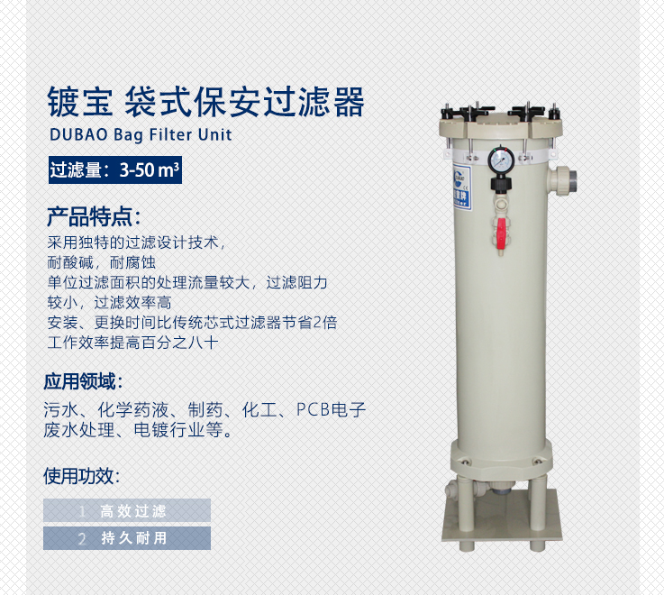 鍍寶耐腐蝕塑料保安過濾器: 產(chǎn)品特點(diǎn): 1、特別適用于電鍍藥夜、化學(xué)藥液、純水循環(huán)過濾等用途。 2、采用日本原裝進(jìn)口......